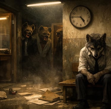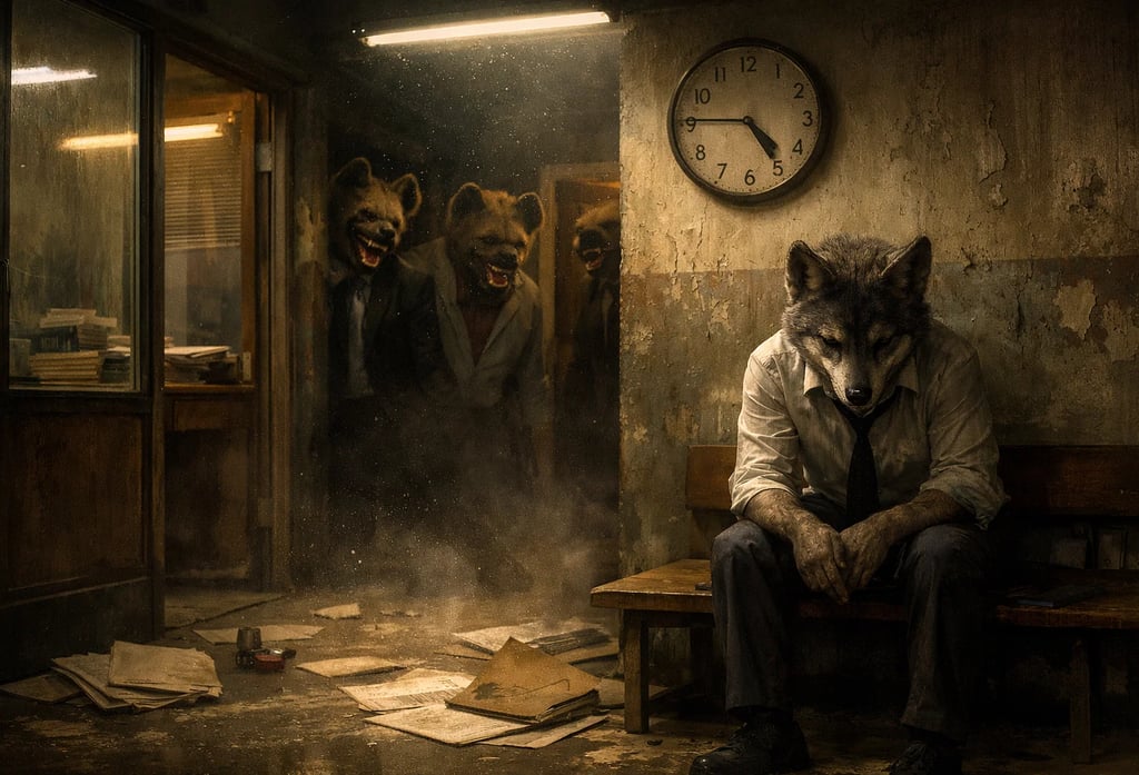 Wchodzisz do pracy pierwszego dnia. Pachnie kawą, tonerami, kurzem segregatorów i czegoś jeszcze. Czegoś czego co znasz, ale nie wiesz, że nim jest. Czyli strachem. Uśmiechasz się, bo wierzysz w mity o „zespole”, „służbie publicznej”, „mentoringu”, „kulturze organizacyjnej” oraz wszystkich innych korzyściach obiecanych jakie Cię czekają w danym miejscu pracy. Bo przecież tak było napisane w ogłoszeniu. Nie widzisz jeszcze i nie wiesz, że właśnie stałeś się padliną. Że gdzieś w rogu biura, za biurkiem, za ladą, za okienkiem urzędniczym, w pokoju obok w wydziale siedzi hiena, która od lat czeka na takich jak Ty. I że robi to za cichym przyzwoleniem tego, który miał cię chronić: Twojego przełożonego, naczelnika, kierownika, czy jak tam się ta... będzie nazywać.